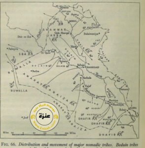 خريطة بعنوان بدو شمال الجزيرة العربية وتوضح منازل قبيلة عنزة وتناقلاتها