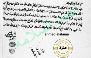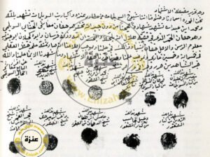 من الوثائق النادرة والهامة لبيع حصان من فصيلة خرسان وأبوه كحيلان، شهد عليها شيوخ وكبار عشيرتي (السويلمات) البائع و(الصقور) المشتري، ونلاحظ ختم الشيخ مشعان بن بكر ( أخو جحلة) والديدب وابن ضلعان وابو الروس ومجموعة أخرى.